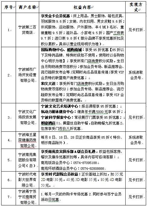 持卡人只需凭卡面上印制的专属会员号,即可享受各大购物中心、知名百货、餐饮酒店等商户的会员礼遇,实现钱包“减负”,优惠尽享。首批联盟商户如下: