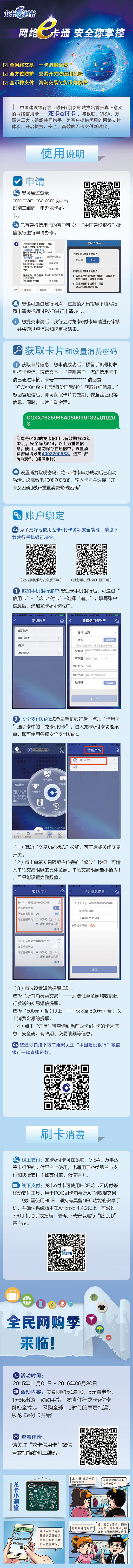 中国建设银行在互联网+创新领域推出首张真正意义的网络信用卡——龙卡e付卡,与银联、VISA、万事达三大卡组织共同携手,为客户提供优质的网络支付体验,开启便捷、安全、高效的无卡支付新时代。