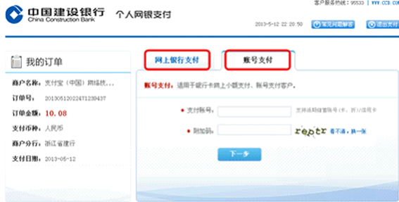 2、非我行网银签约客户,但持有我行借记卡或者信用卡,网上支付时选择“中国建设银行—账号支付”,输入卡号、验证预留号码即可支付成功。