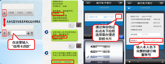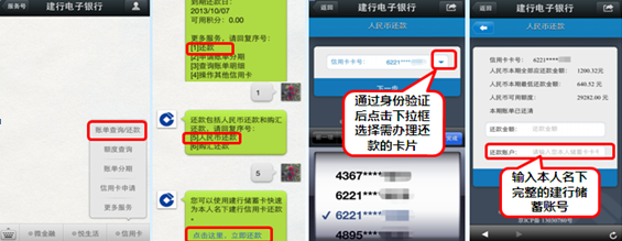 添加我行微信公众账号并完成信用卡绑定后,可通过以下方式办理人民币还款: