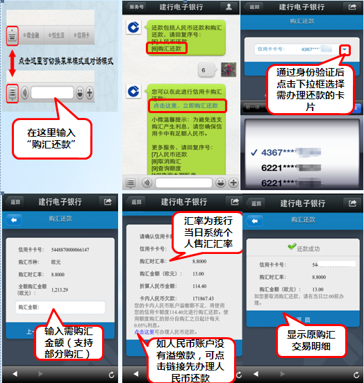 添加我行微信公众账号并完成信用卡绑定后,可通过以下方式办理外币账户已出账单购汇还款