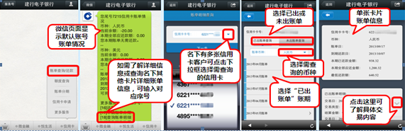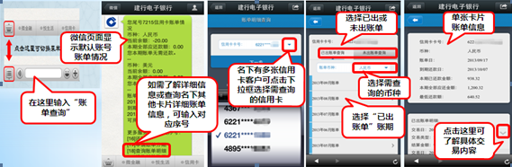 添加我行微信公众账号并完成信用卡绑定后,可通过以下方式查询您的账单: