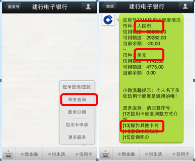 添加我行微信公众账号并完成信用卡绑定后,可通过以下方式查询默认账户额度。