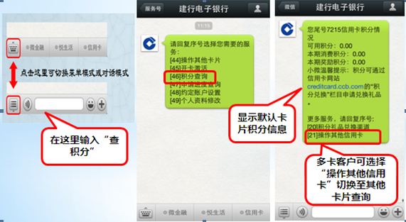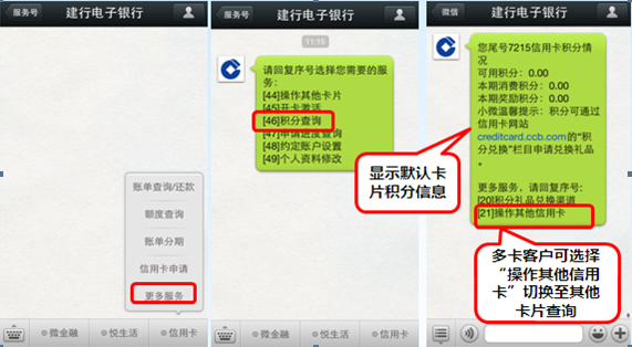 添加我行微信公众账号并完成信用卡绑定后,可通过以下方式查询默认卡片积分信息。
