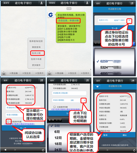 添加我行微信公众账号并完成信用卡绑定后,在本期账单到期还款日22:00点前办理可通过以下方式办理账单分期